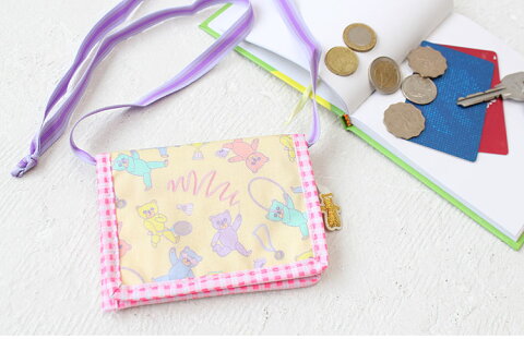 首や肩から下げられるリボンテープ付きで、ポシェット感覚で持ち歩けるアイテム。